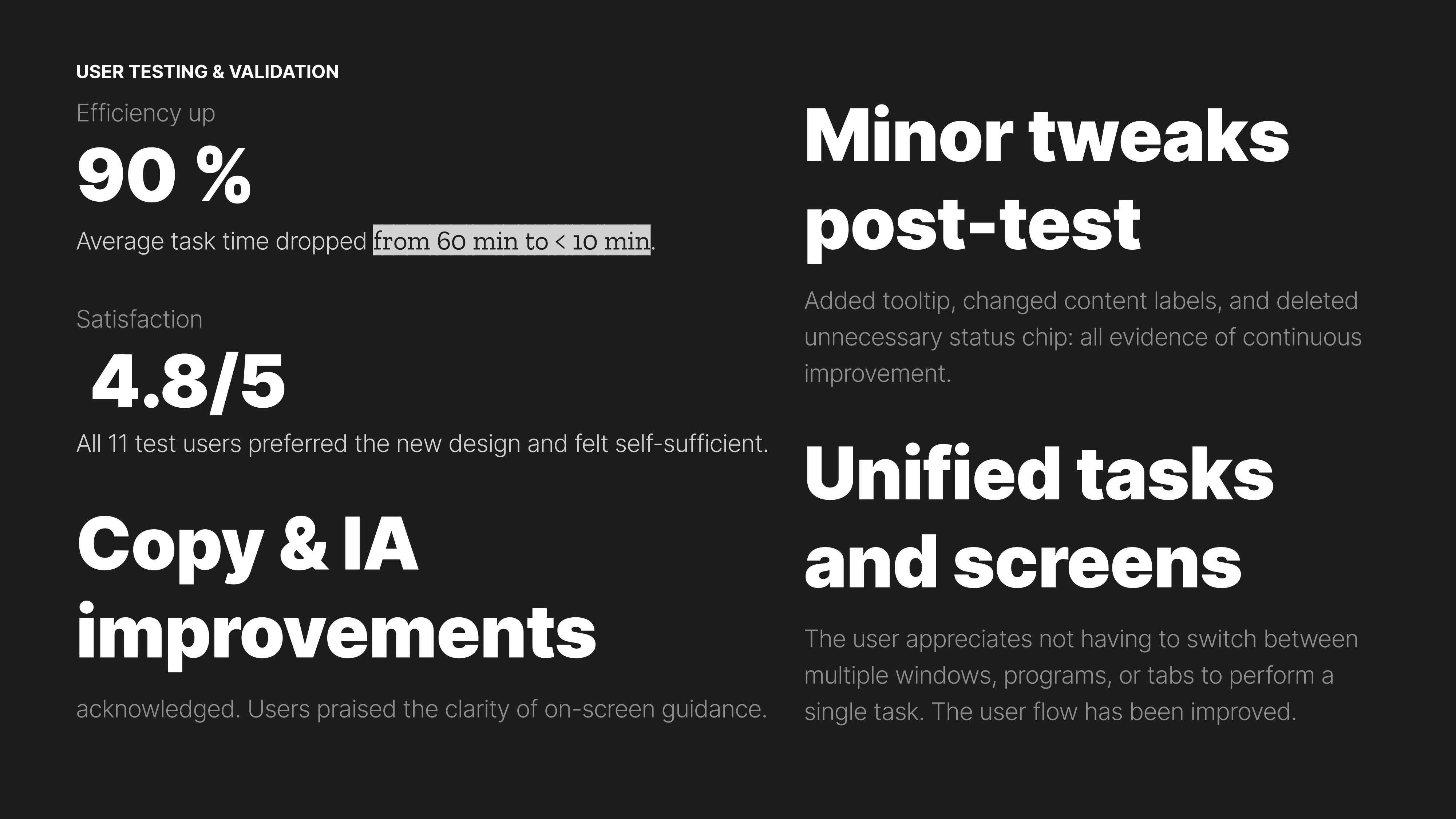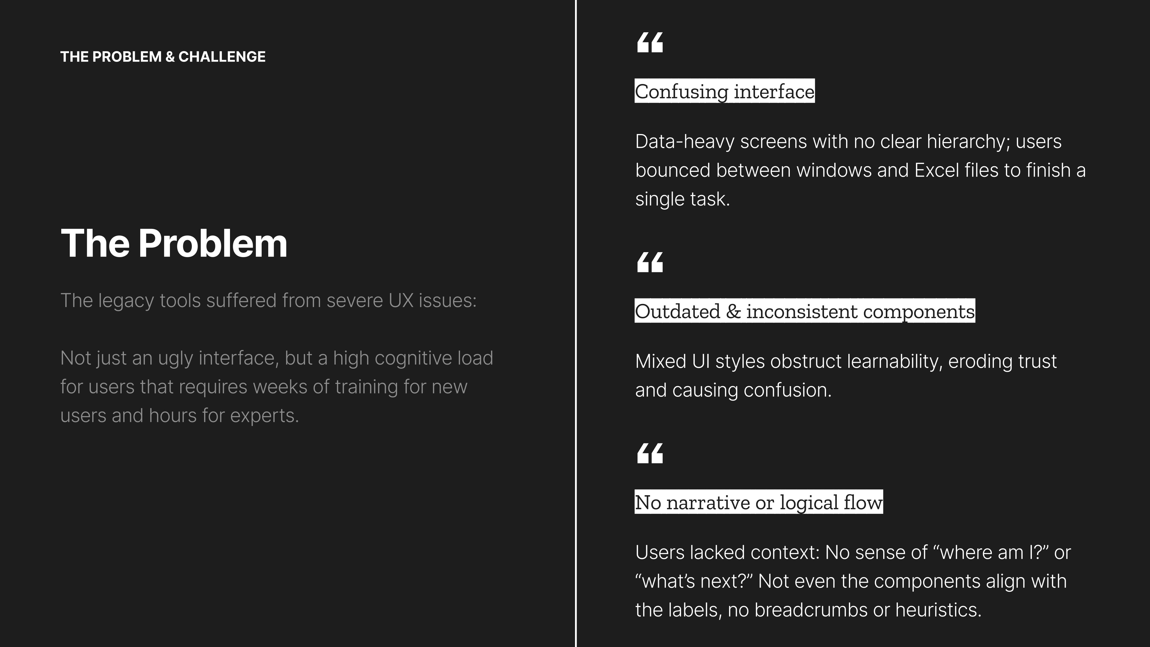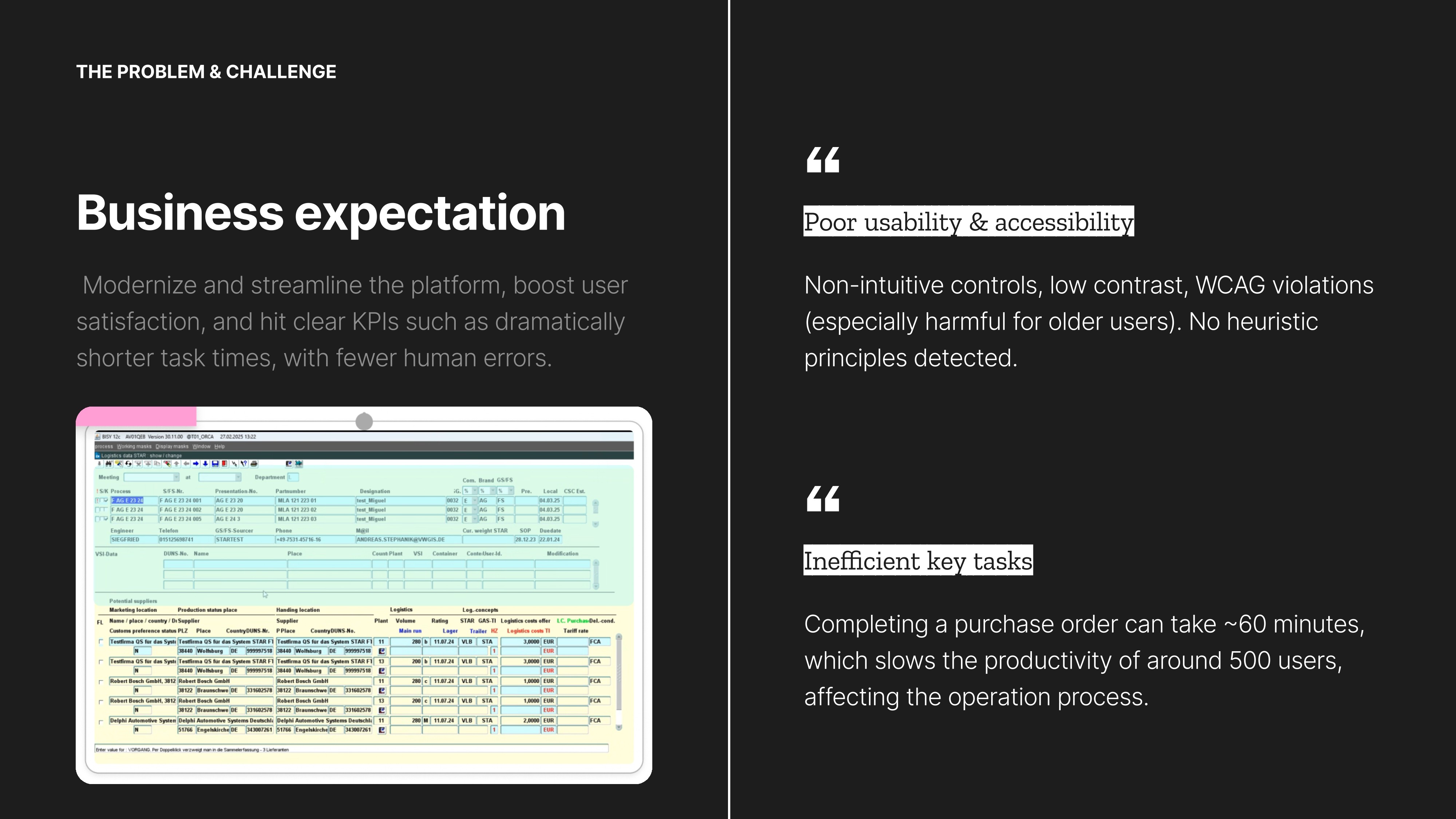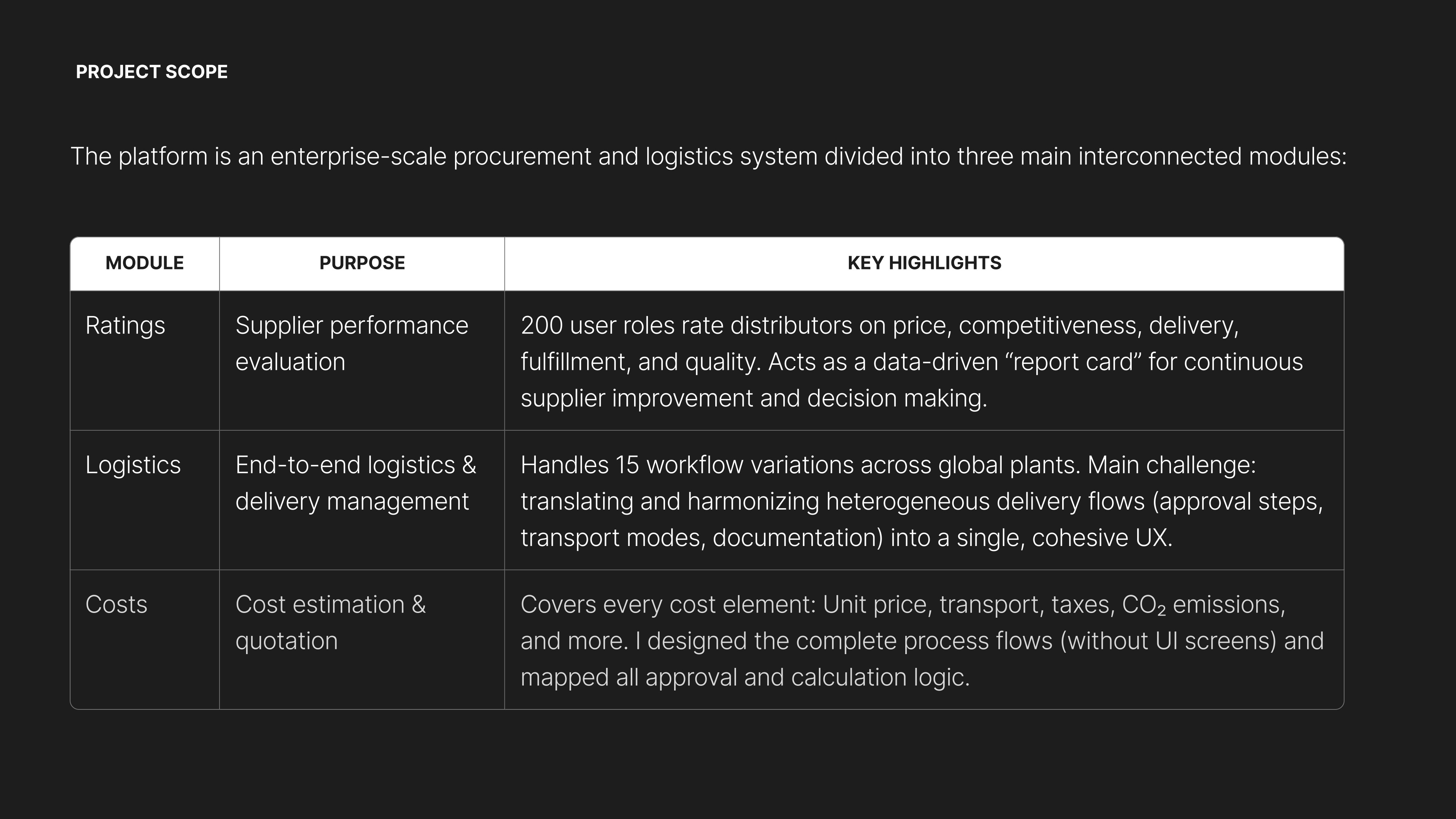 Legacy operations were stifled by high cognitive load: users juggled 5 disparate windows and manual Excel updates just to complete a single shipment. My goal was to transform 4 disconnected tools into 1 unified platform. The result is a centralized SaaS that reduces operational friction, cutting average task time by 90% (from 60 to 8 minutes) for users across 15 global plants.