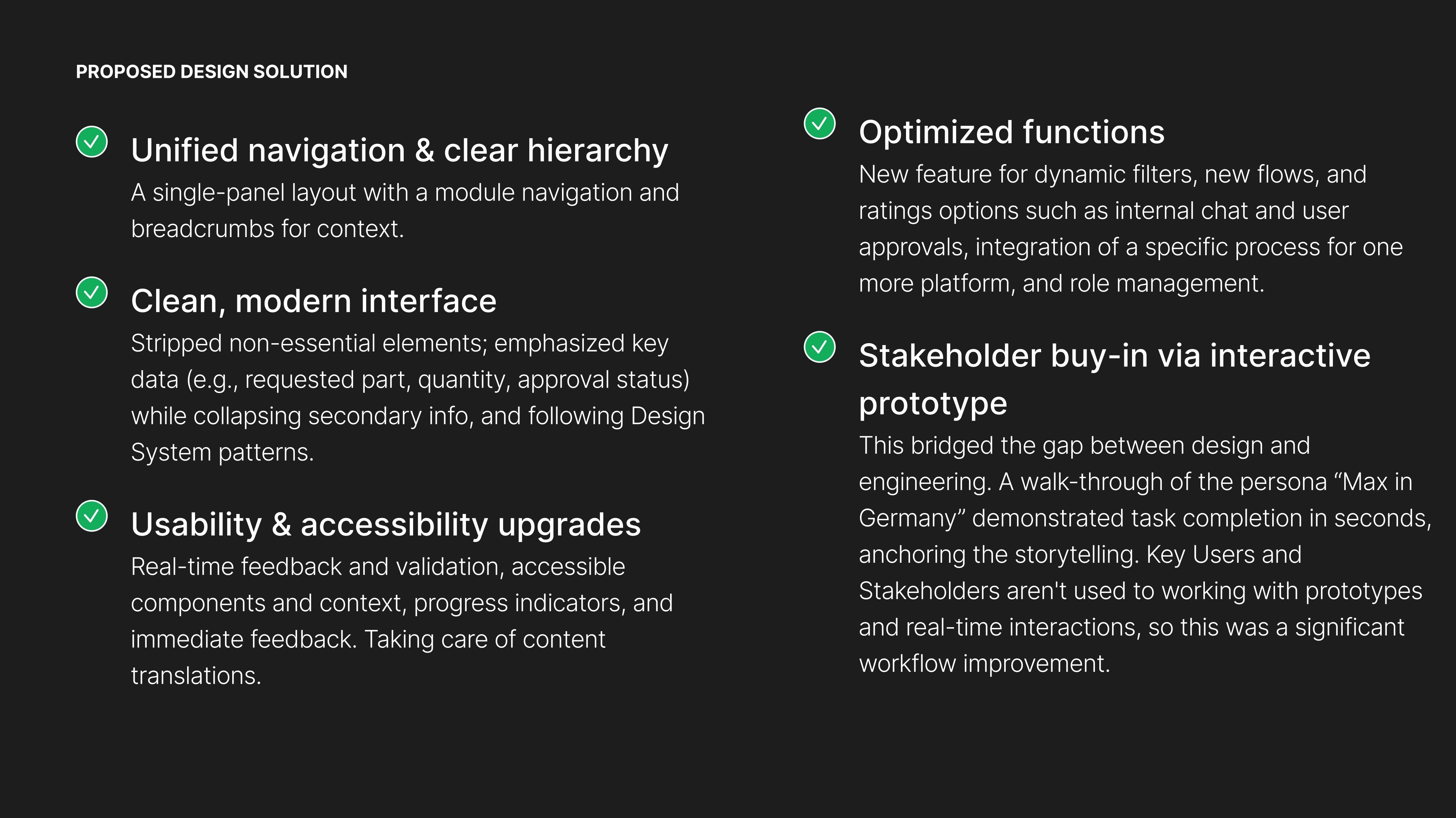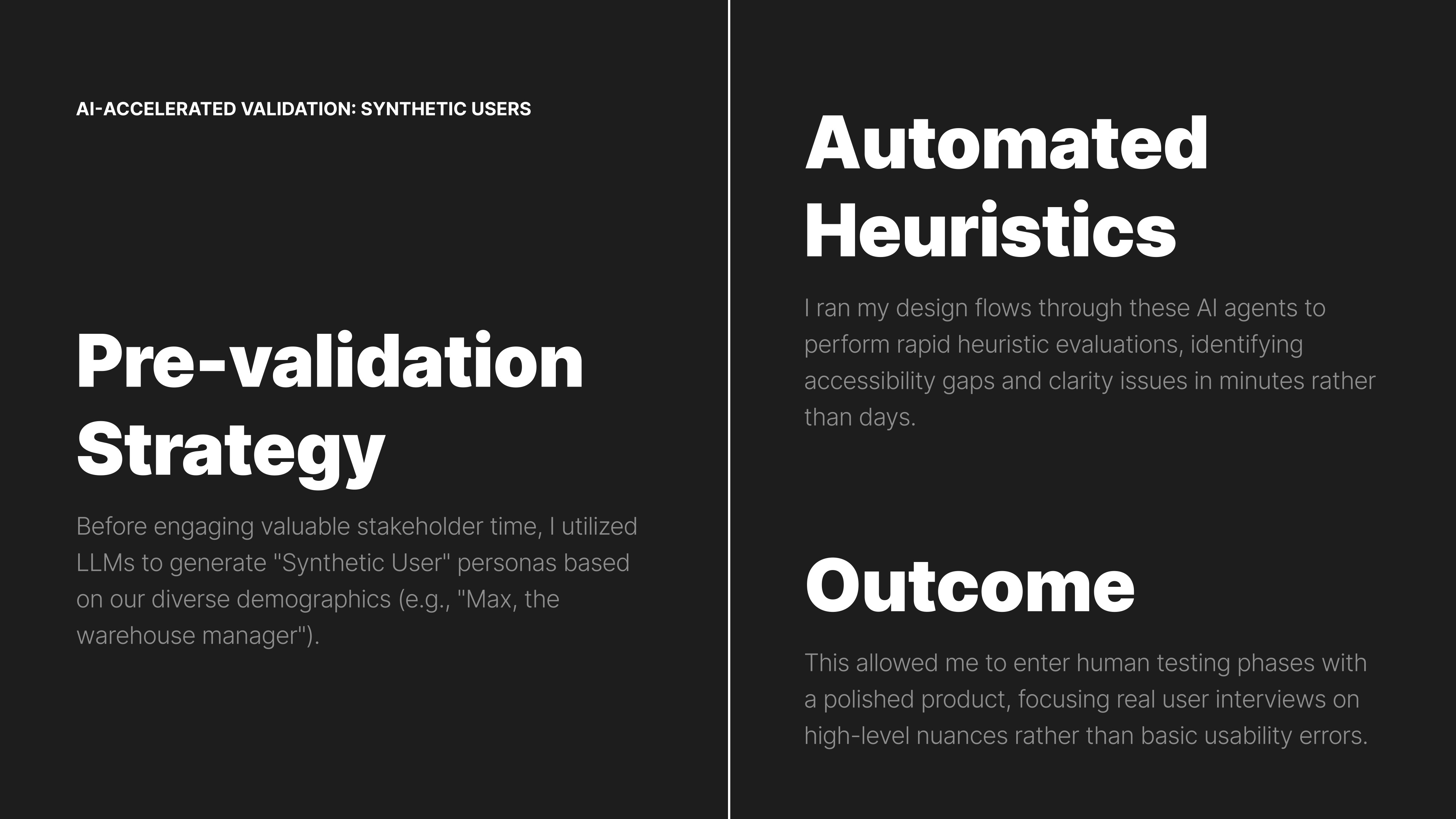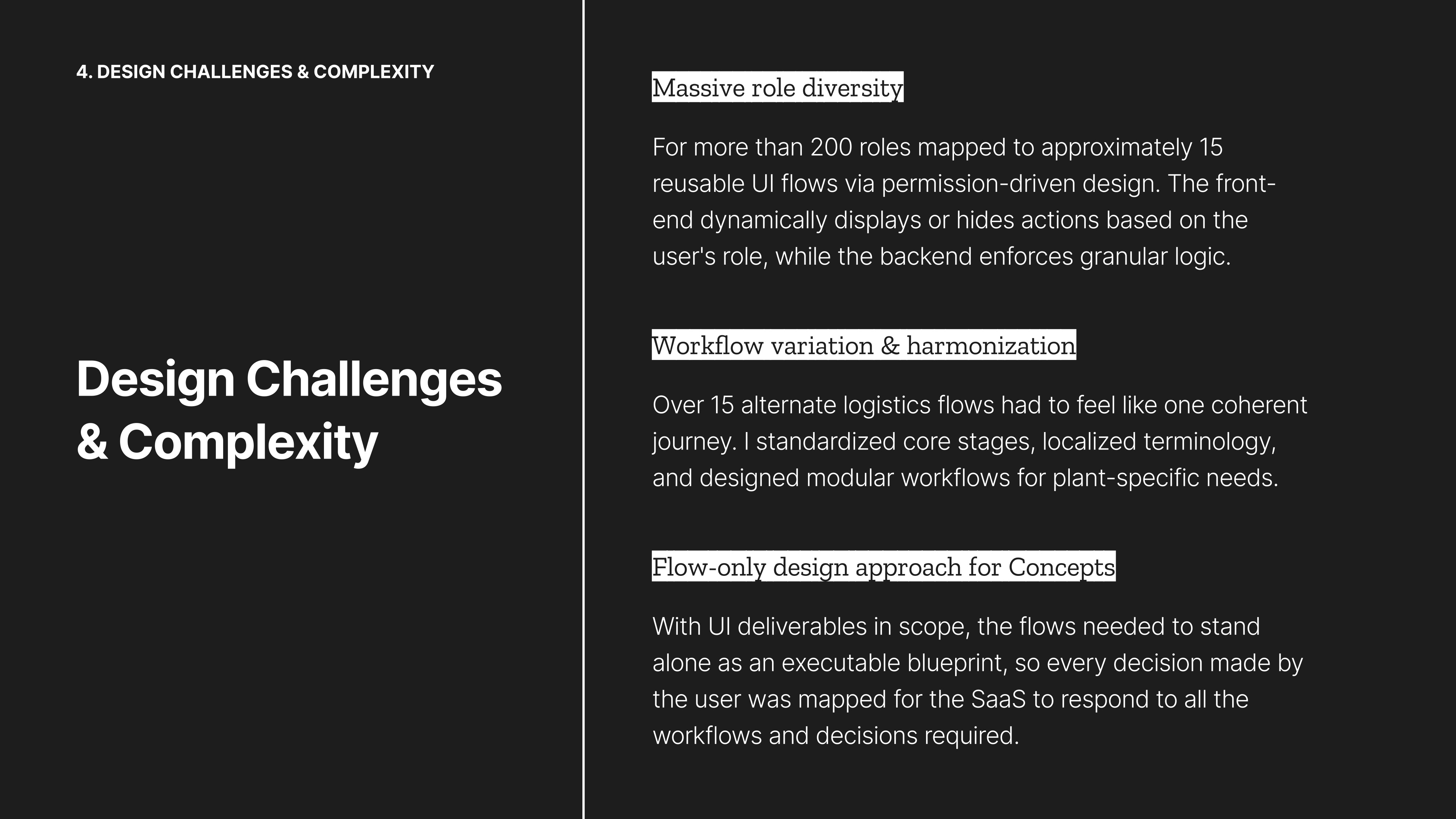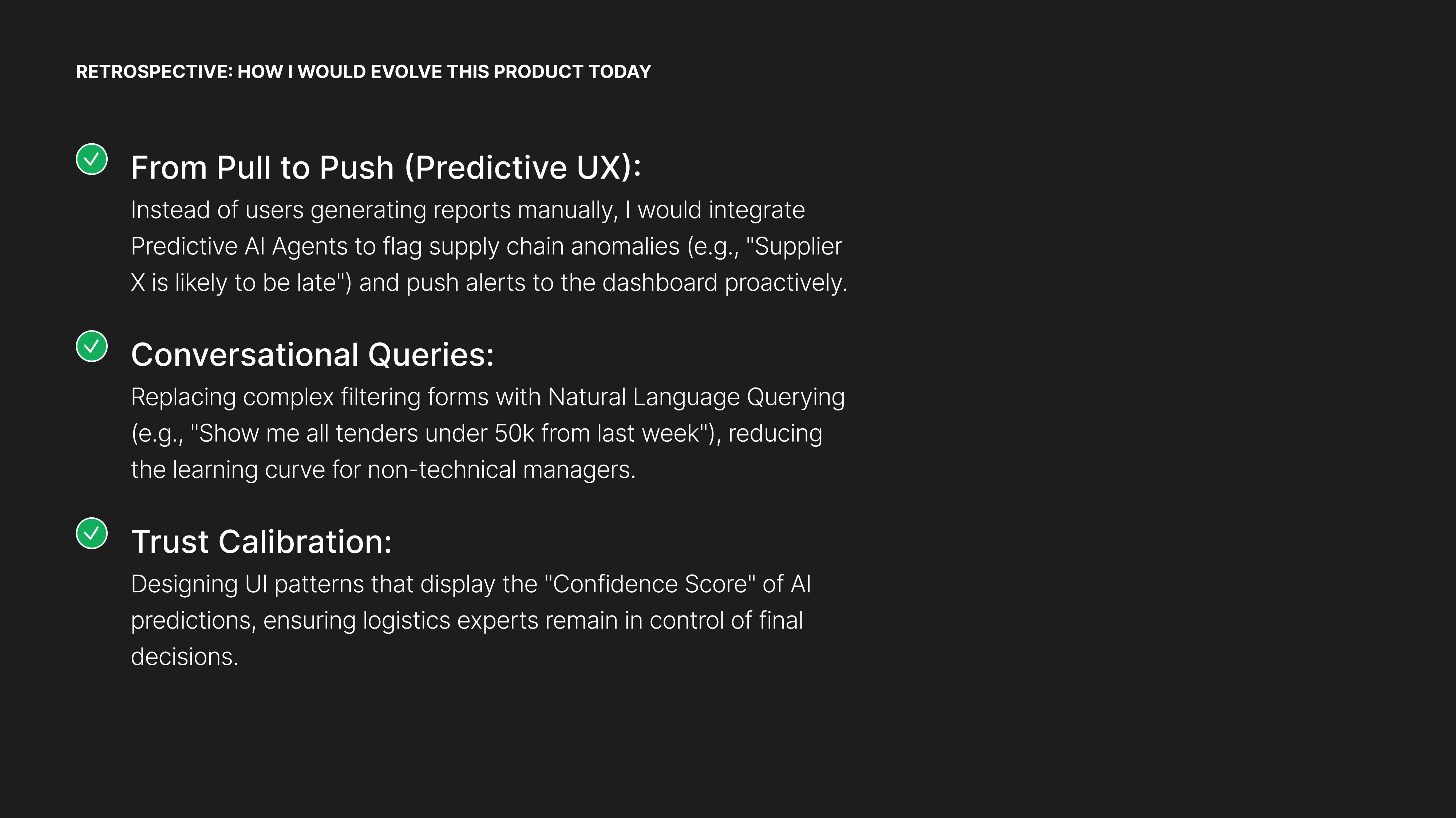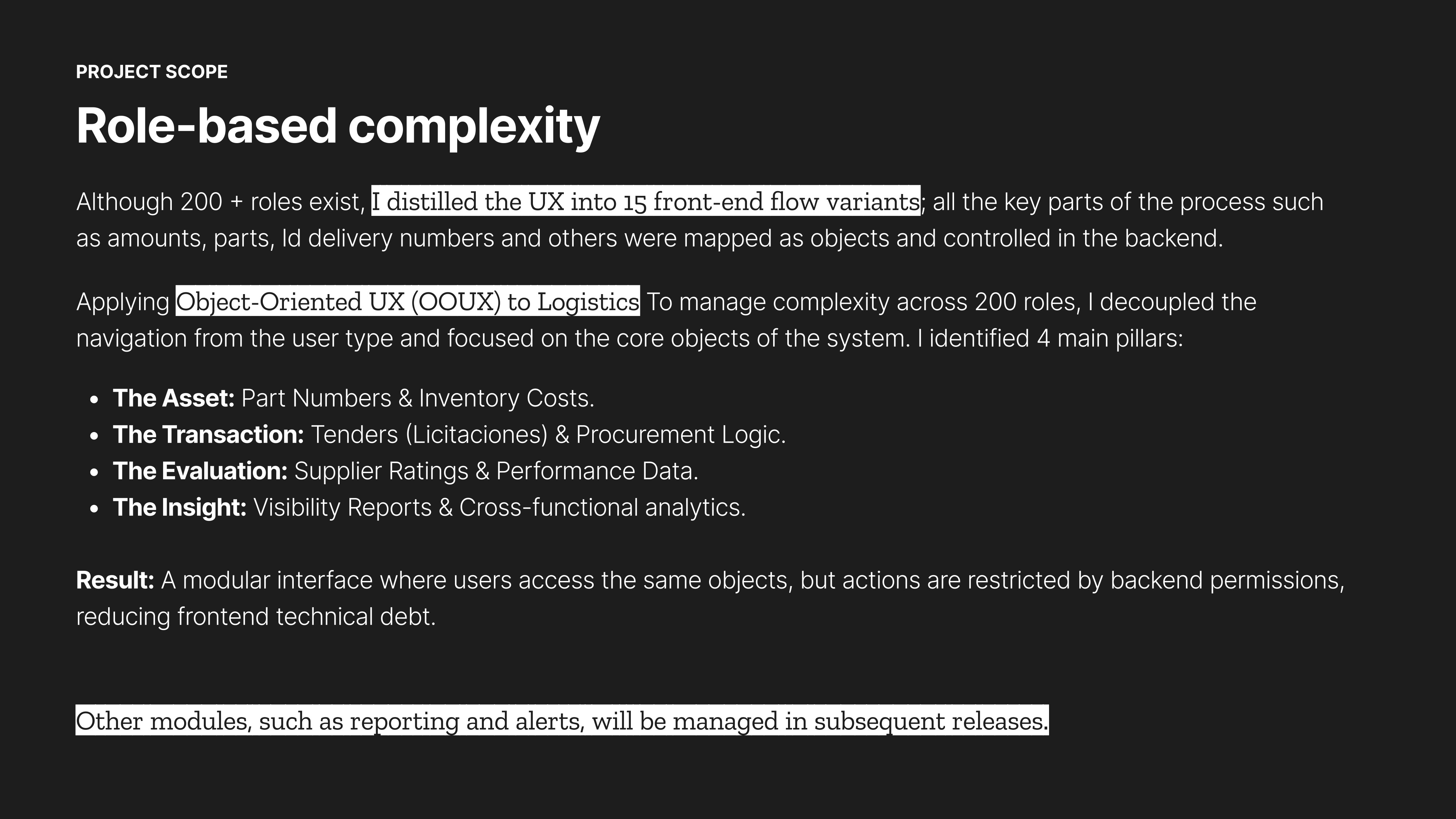 I applied System Thinking and OOUX (Object-Oriented UX) to map the complex relationships between 200+ user roles and logistical data. Moving beyond traditional flows, I utilized AI-accelerated workflows to rapidly prototype and validate complex logic. This allowed me to deliver a scalable, modular architecture that simplifies decision-making without sacrificing the data density required by expert users.